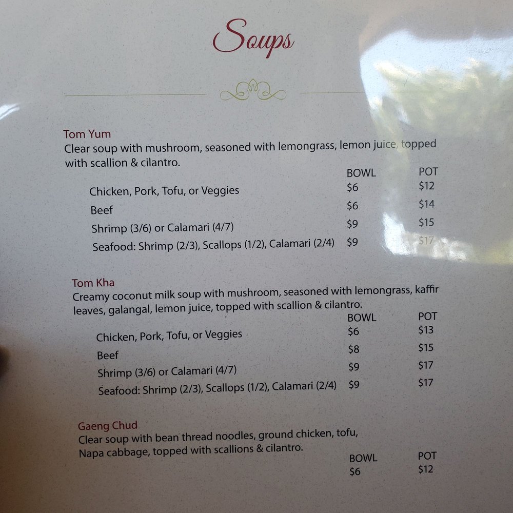 Creamy coconut milk soup with mushroom, seasoned with lemongrass, kaffir leaves, galanga, lemon juice, topped with scallion and cilantro. *Please note that this item cannot be prepared vegan nor vegetarian.*